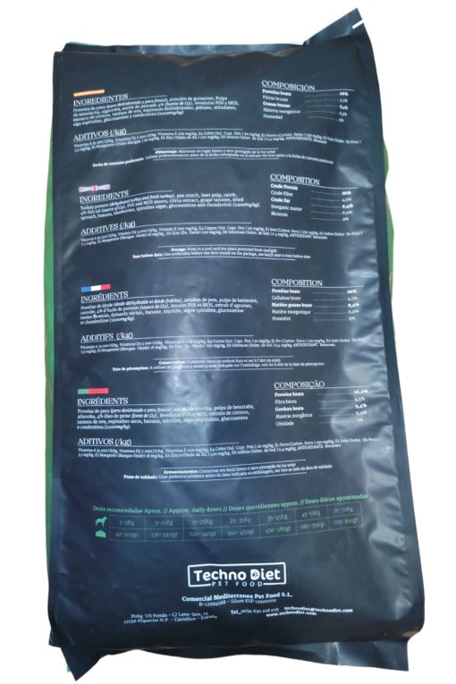 Proteína de pavo (pavo deshidratado y pavo fresco), almidón de guisantes, Pulpa de remolacha, algarroba, aceite de pescado 4% (fuente de Ω3), levaduras FOS y MOS, extracto de cítricos, taninos de uva, espinacas deshidratadas, plátano, arándanos, alga espirulina, glucosamina y condroitina (2200mg/kg).